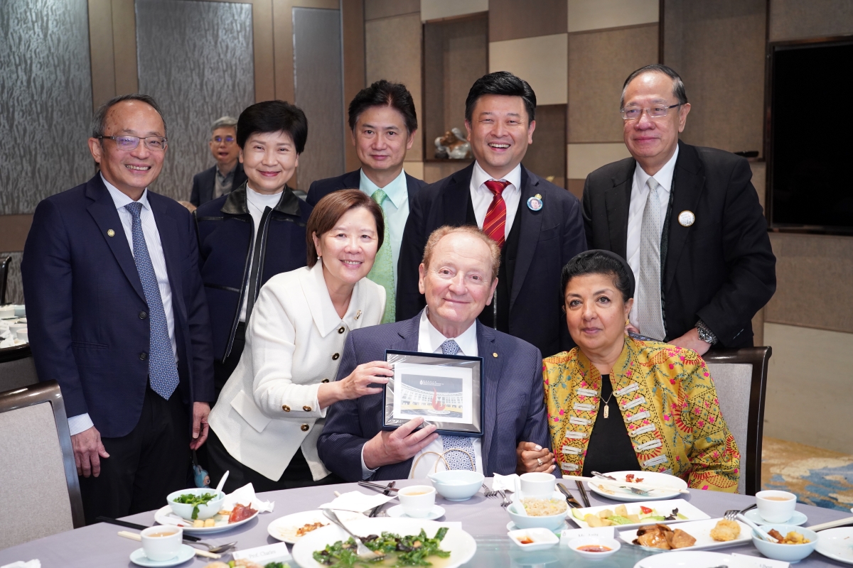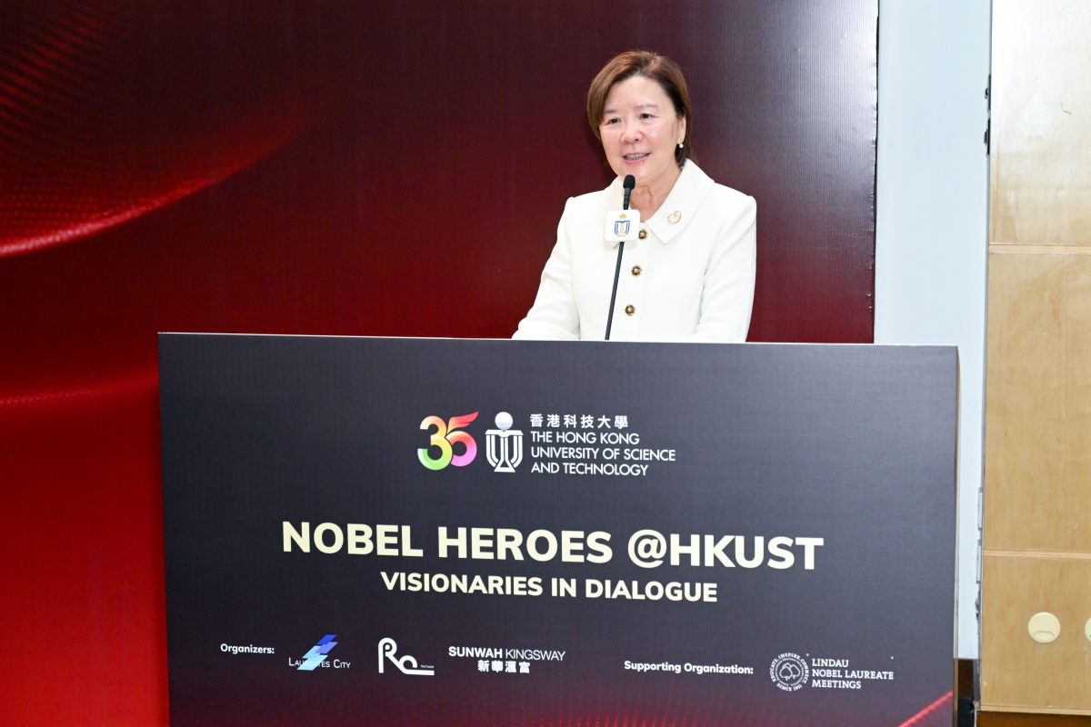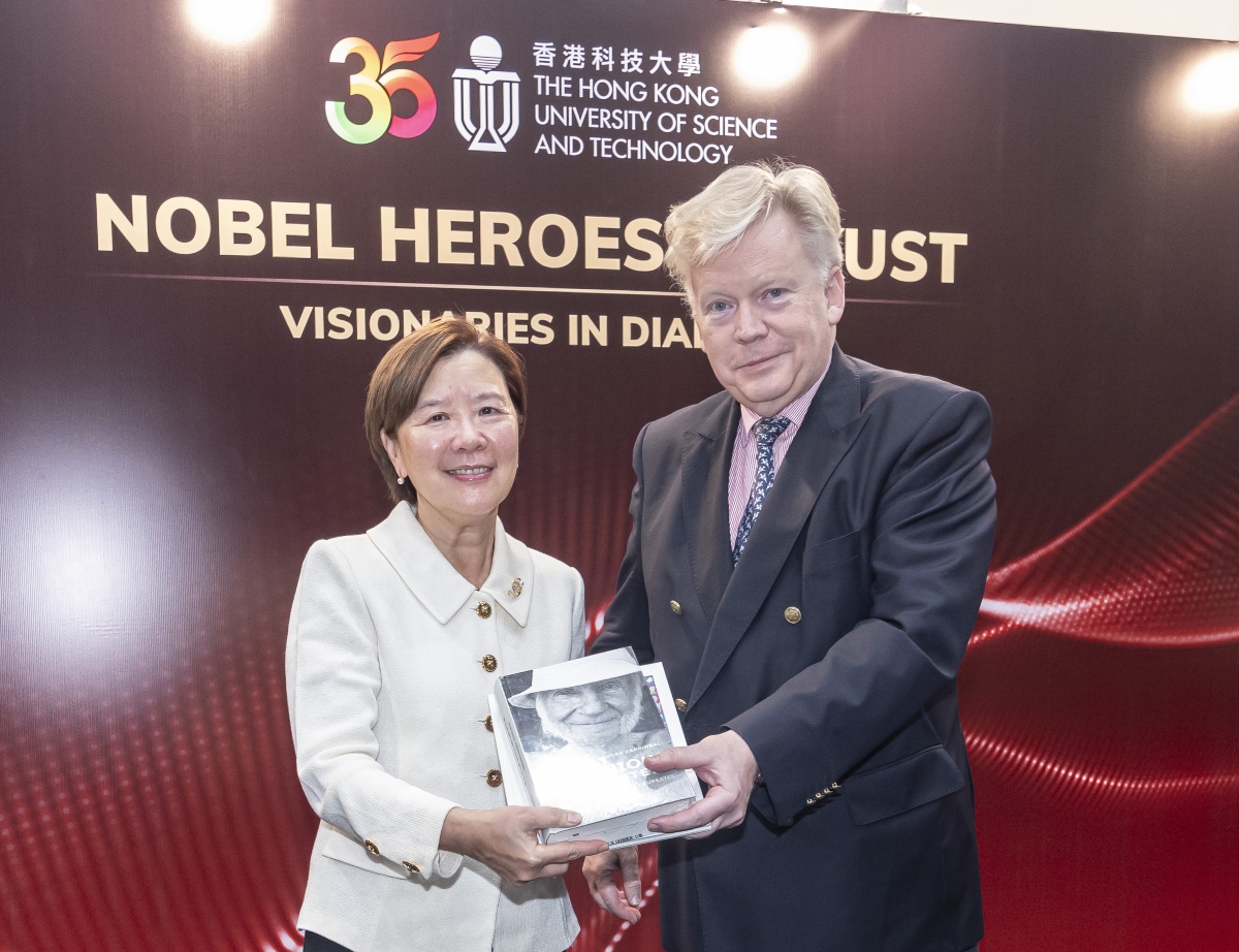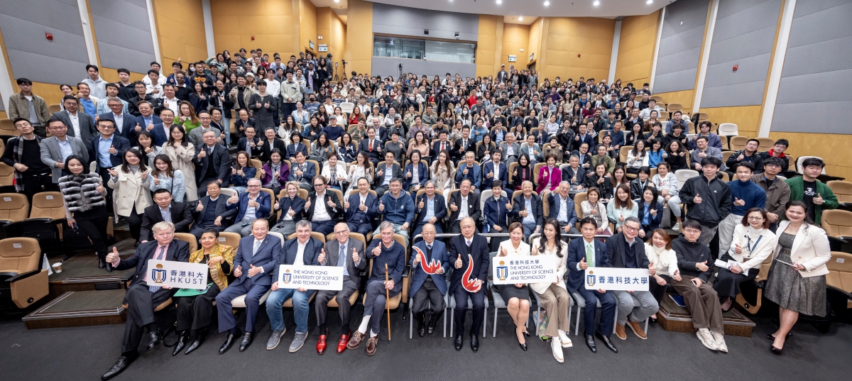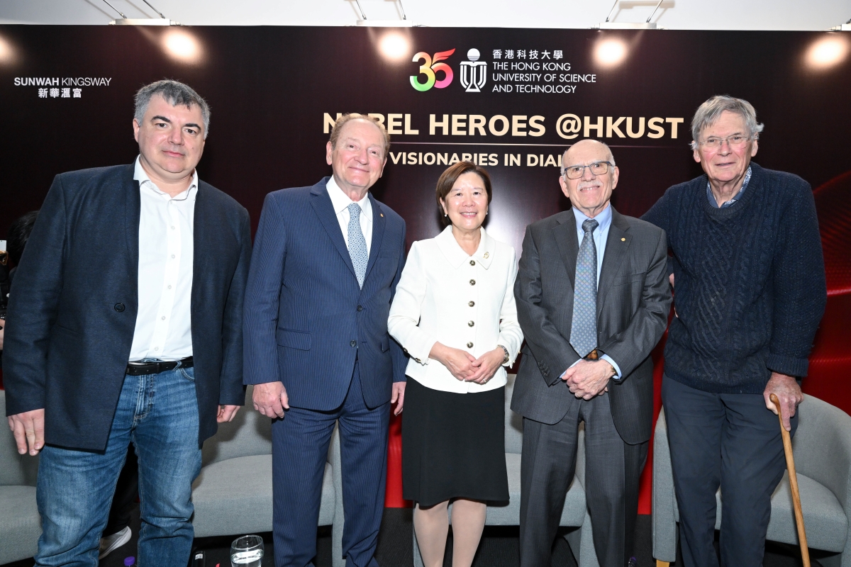 A group photo with the four Nobel Laureates Prof Tim Hunt (fifth right), Prof Louis J. Ignarro (forth right), Prof Robert C. Merton (sixth left) and Prof Konstantin Novoselov (fifth left), HKUST senior management and our esteemed guests