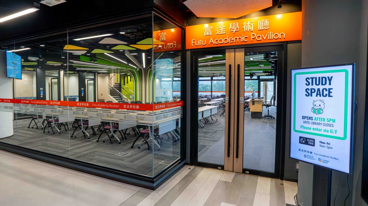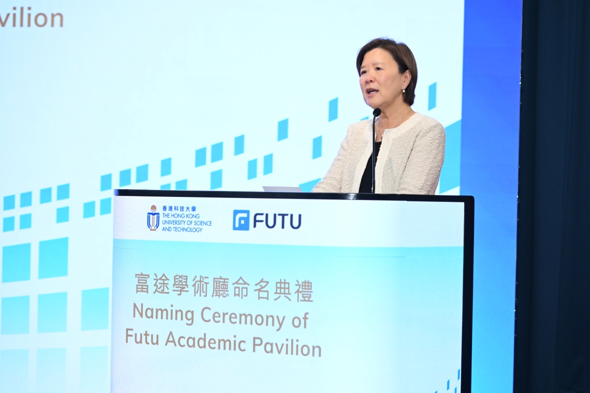 HKUST held a naming ceremony for the Futu Academic Pavilion. The officiating guests included Mr. Arthur CHEN, Chief Financial Officer of Futu Holdings (third right); Mr. Jeff SHI, Regional Director of Futu Securities (second right); Mr. Daniel TSE, Managing Director of Futu Securities (first right); Prof. Nancy IP, President (third left); Prof. Charles Wang-Wai NG, Vice-President for Institutional Advancement (second left); and Prof. Tim Kwang-Ting CHENG, Vice-President for Research and Development at HKUST (first left).